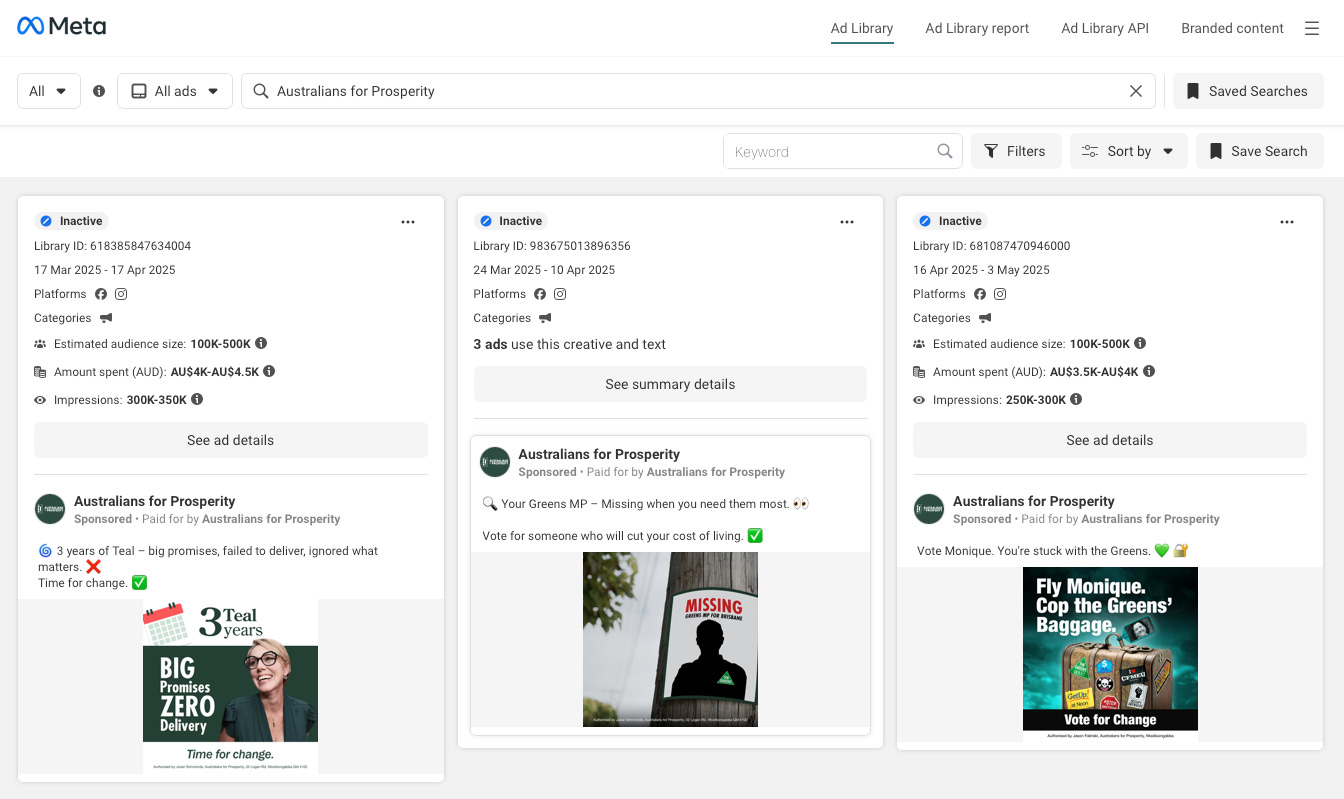 Australians for Prosperity received almost $3.7 million from Coal Australia and in the lead-up to the 2025 election, spent $234,000 running paid Facebook ads targeting the Australian Greens, ‘Teal’ Independent candidates and the Albanese Government, according to analysis prepared by the University of Technology Sydney.