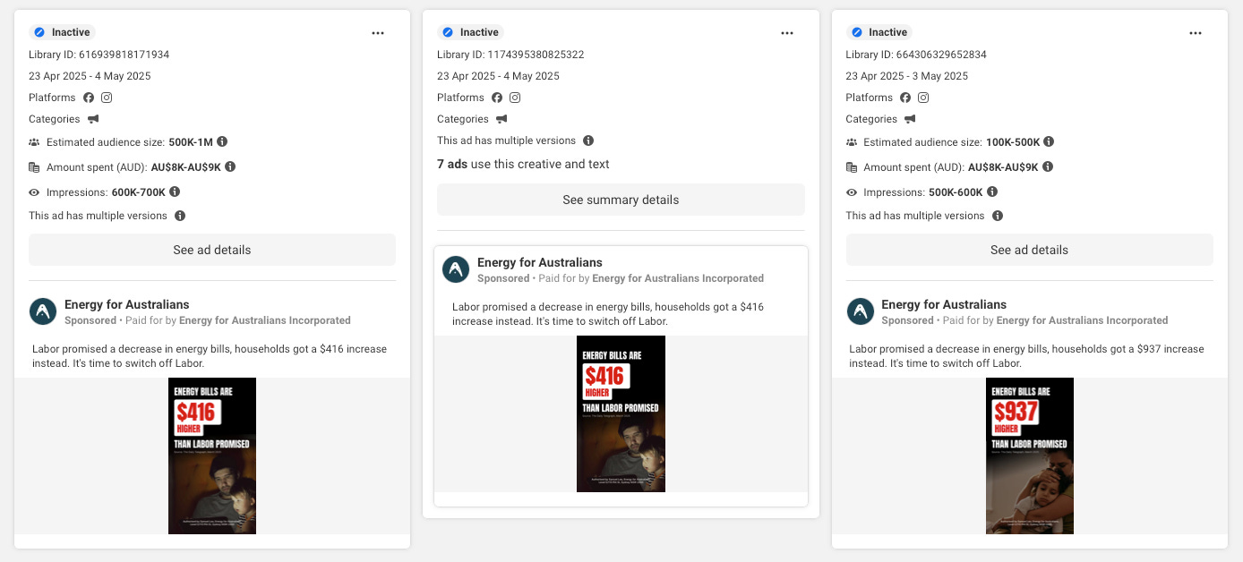 Energy for Australians spent $136,000 on Facebook ads, focused on blaming Labor for higher electricity prices.